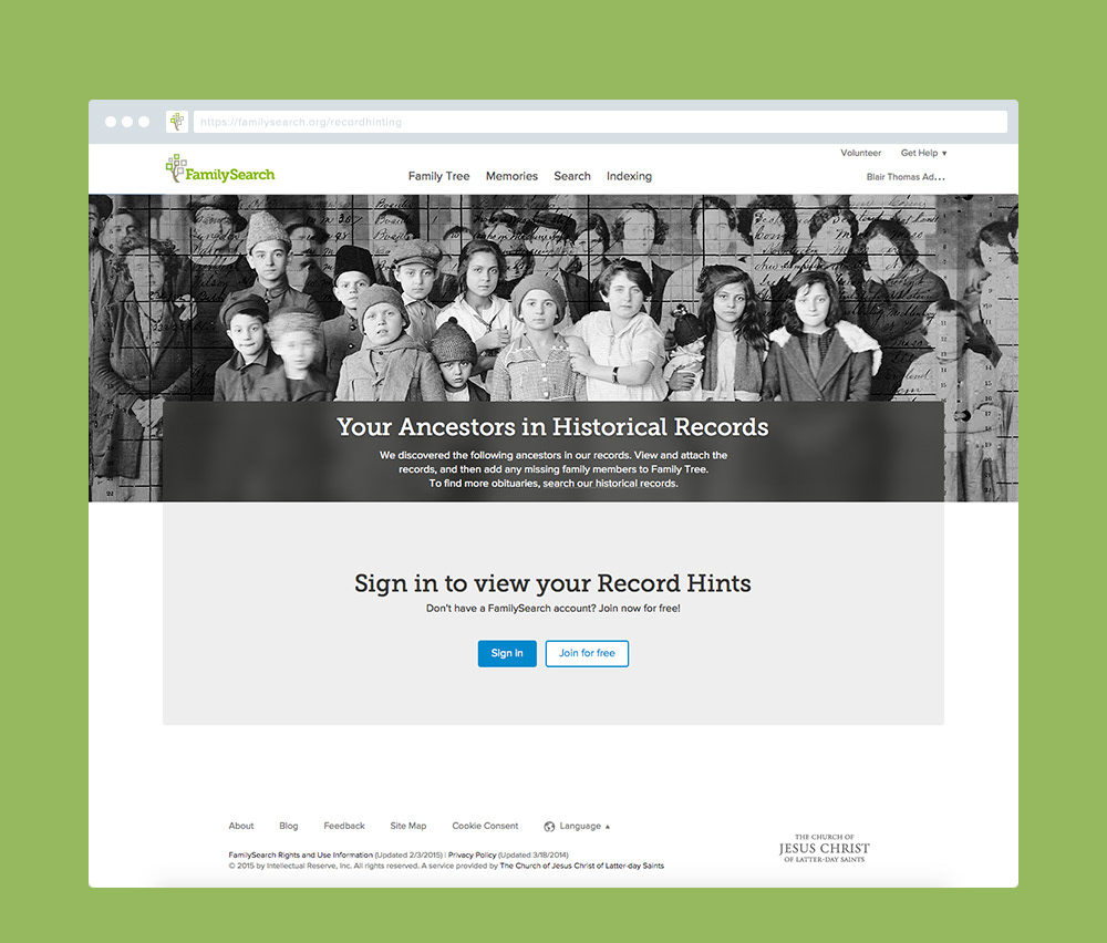 This was a landing page I designed for a Record Hinting Campaign by FamilySearch.